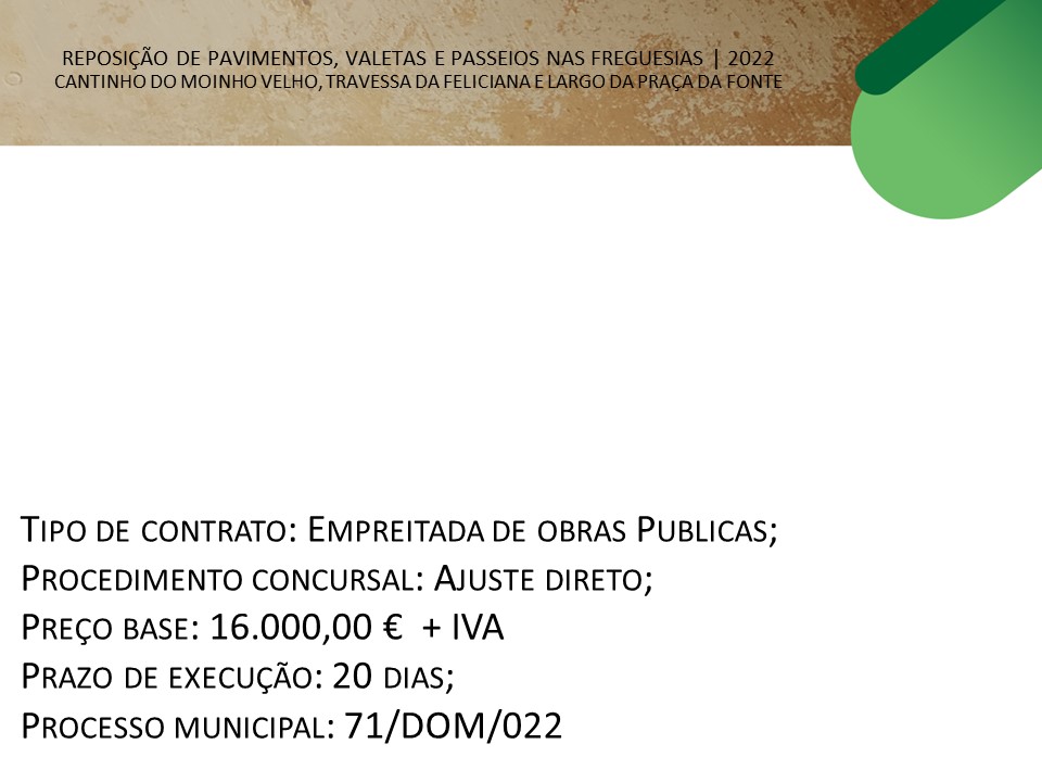 71/2022_REPOSIÇÃO DE PAVIMENTOS, VALETAS E PASSEIOS NAS FREGUESIAS | 2022 - CANTINHO DO MOINHO VELHO, TRAVESSA DA FELICIANA E LARGO DA PRAÇA DA FONTE