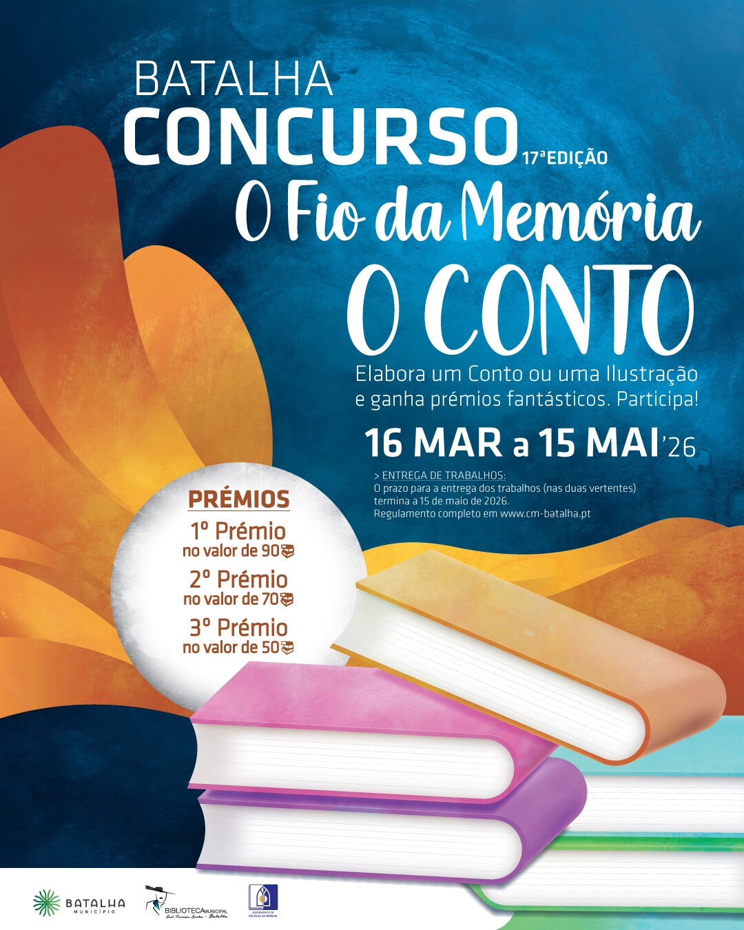 Município da Batalha lança a 17.ª edição do concurso literário ❞𝗢 𝗙𝗶𝗼 𝗱𝗮 𝗠𝗲𝗺𝗼́𝗿𝗶𝗮 – 𝗢 𝗖𝗼𝗻𝘁𝗼❞, que decorre entre 𝟭𝟲 𝗱𝗲 𝗺𝗮𝗿𝗰̧𝗼 𝗲 𝟭𝟱 𝗱𝗲 𝗺𝗮𝗶𝗼, e pretende valorizar o conto e a ilustração, incentivar a escrita criativa e os hábitos de leitura, potenciar a descoberta de novos talentos, e ainda, preservar a tradição literária e artística do concelho, salientando as principais histórias da Batalha.